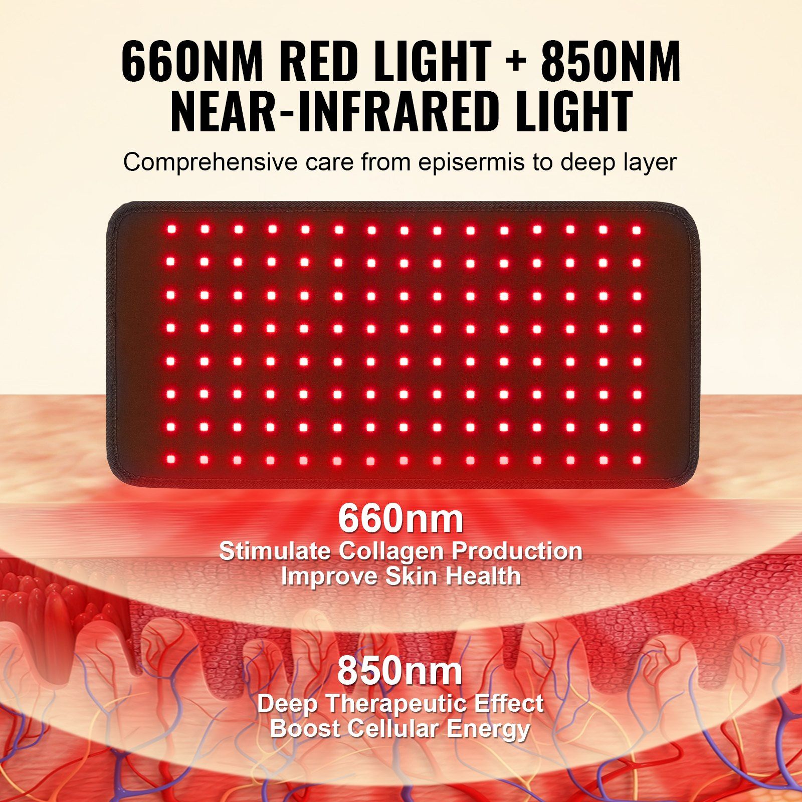 Relax and rejuvenate with professional red light therapy. VEVOR red light therapy pad enhances blood circulation, alleviates muscle and joint pain, accelerates wound healing, increases collagen production, and improves sleep.