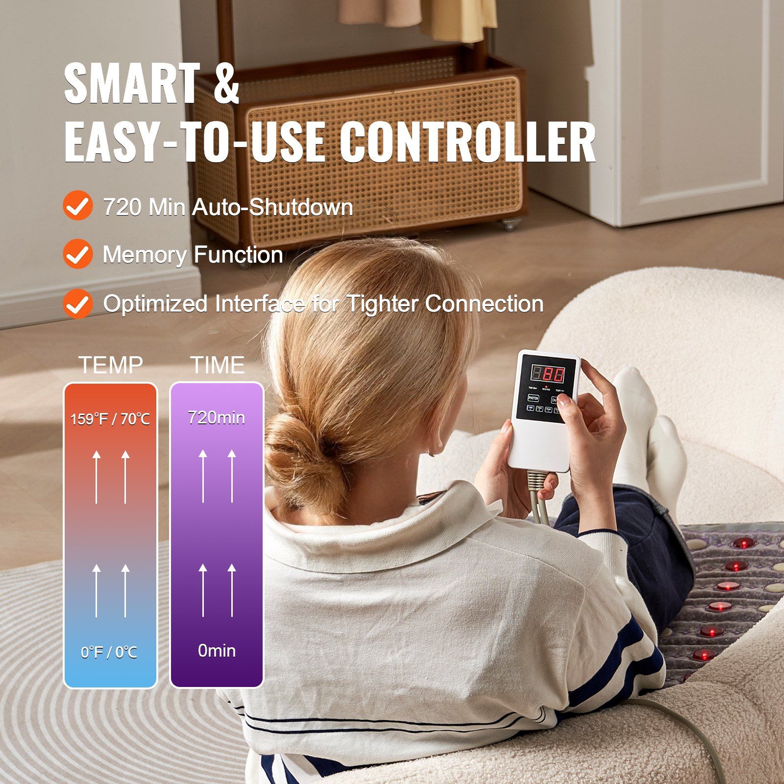 Adjust the temperature from 103°F to 159°F with the smart controller. It also features a memory function that remembers your last settings, 0 - 720 mins timer setting along with an automatic shut-off feature to prevent overuse and ensure you never forget to turn it off.